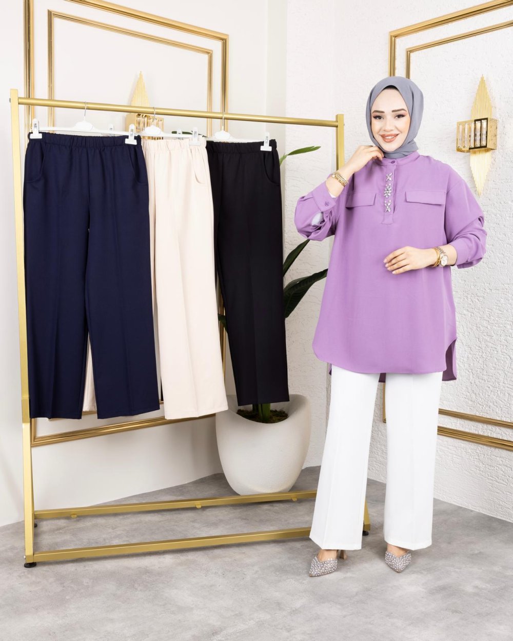 Her vücut tipine kolayca uyum sağlayan bu model, 1-2-3-4 beden seçenekleriyle 38-48 beden aralığına hitap eder. 100 cm boy uzunluğu sayesinde hem klasik hem spor ayakkabılarla kombinlenebilir. İthal double kumaşı ile hafif, dökümlü ve şık bir duruş sunan pantolon, dolabınızın vazgeçilmez parçalarından biri olacak.