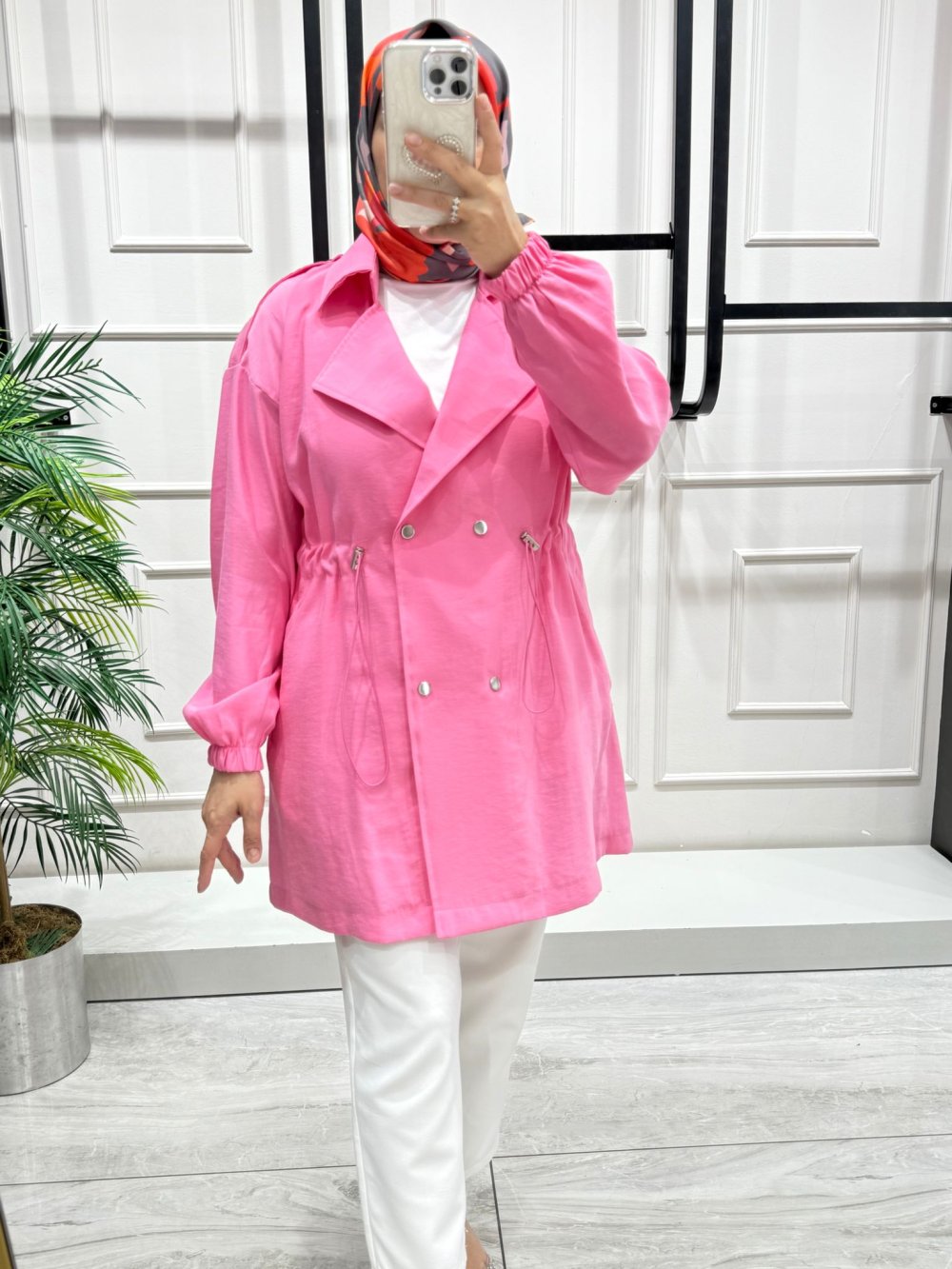Modern çizgilerle tasarlanmış bu modelde bel kısmındaki stoper detayı sayesinde ceketi kendi bedeninize göre şekillendirebilir şık bir siluet elde edebilirsiniz. Önde yer alan çıt çıt detayları sayesinde kullanım kolaylığı sunarken yan cepler hem şıklık hem işlevsellik katıyor.
