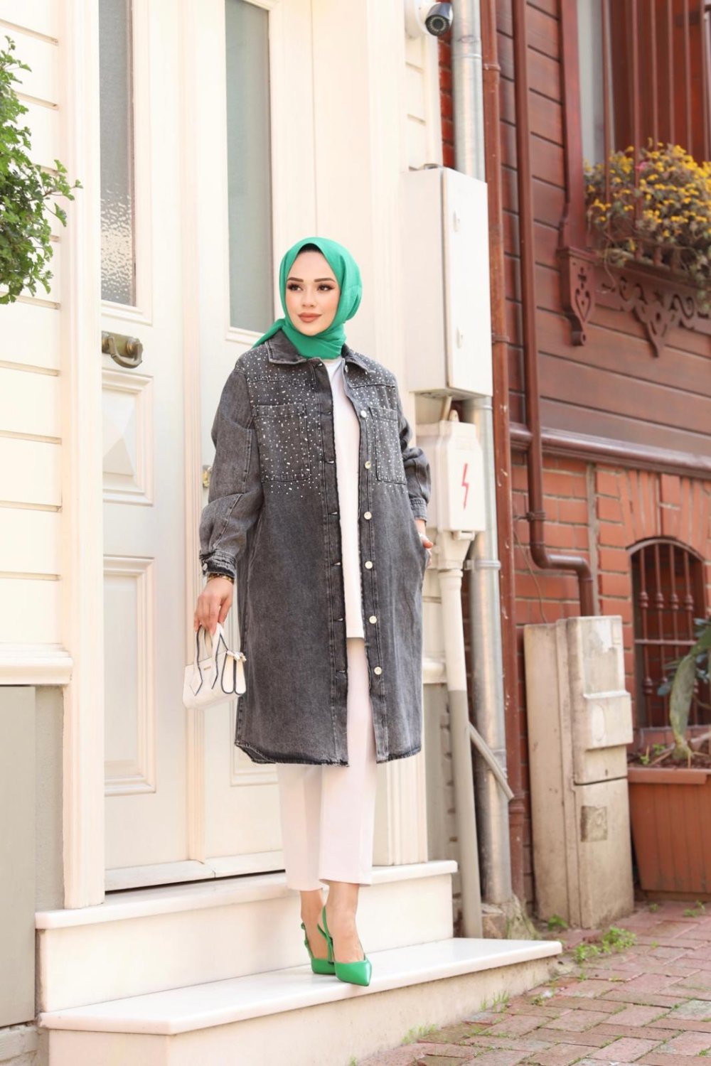Taş detaylarıyla ışıldayan bu uzun kot ceketle her adımda şıklığınızı konuşturun!