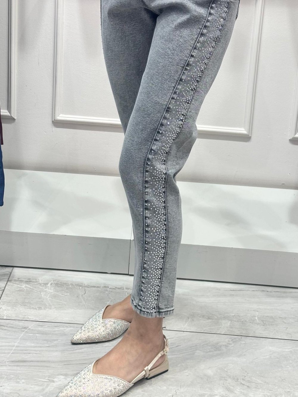Şerit Taşlı Likralı Kot Pantolon Gri