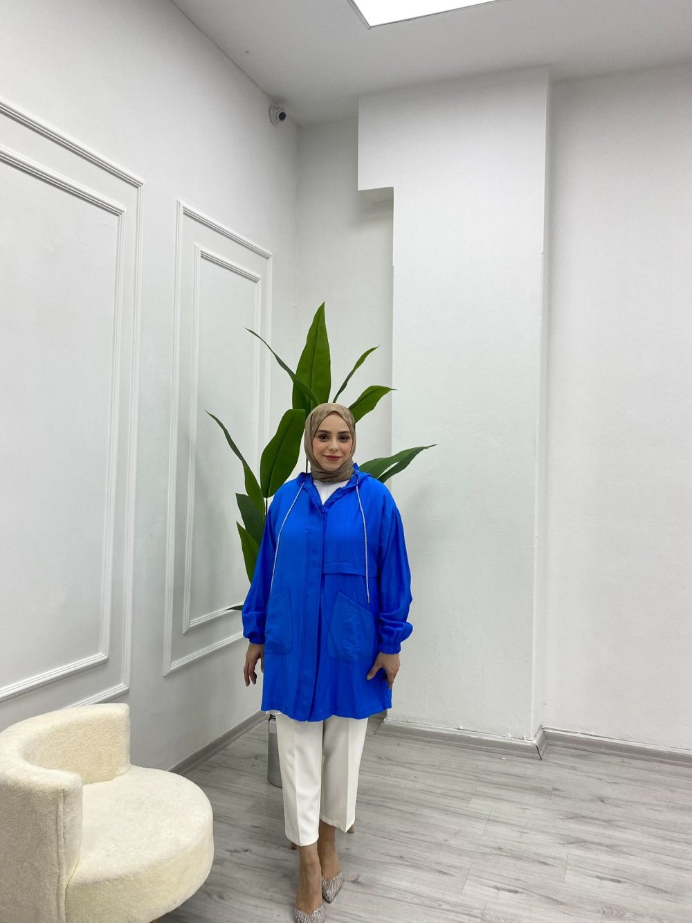 Şıklığı tamamlayan en dikkat çekici detay ise kapüşon kısmındaki simli kordonlar. Bu özel dokunuş sade görünümünü zarif bir şekilde tamamlar.