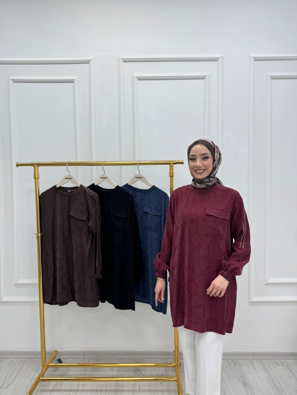 Zarafeti ve konforu bir araya getiren bu özel tasarım tunik, jakar dokuma ipek kupra kumaşıyla hem hafif hem de nefes alabilen bir yapı sunar. 85 cm uzunluğu sayesinde günlük kullanımda rahatlık sağlarken, şık duruşuyla özel günlerde de tercih edilebilir.