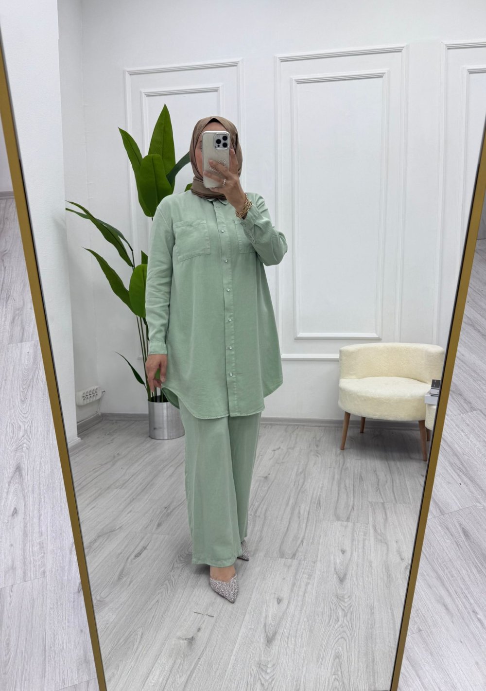 Tensel Kumaş İkili Takım Lastikli Pantolonlu Yazlık ve Mevsimlik Mint Yeşili