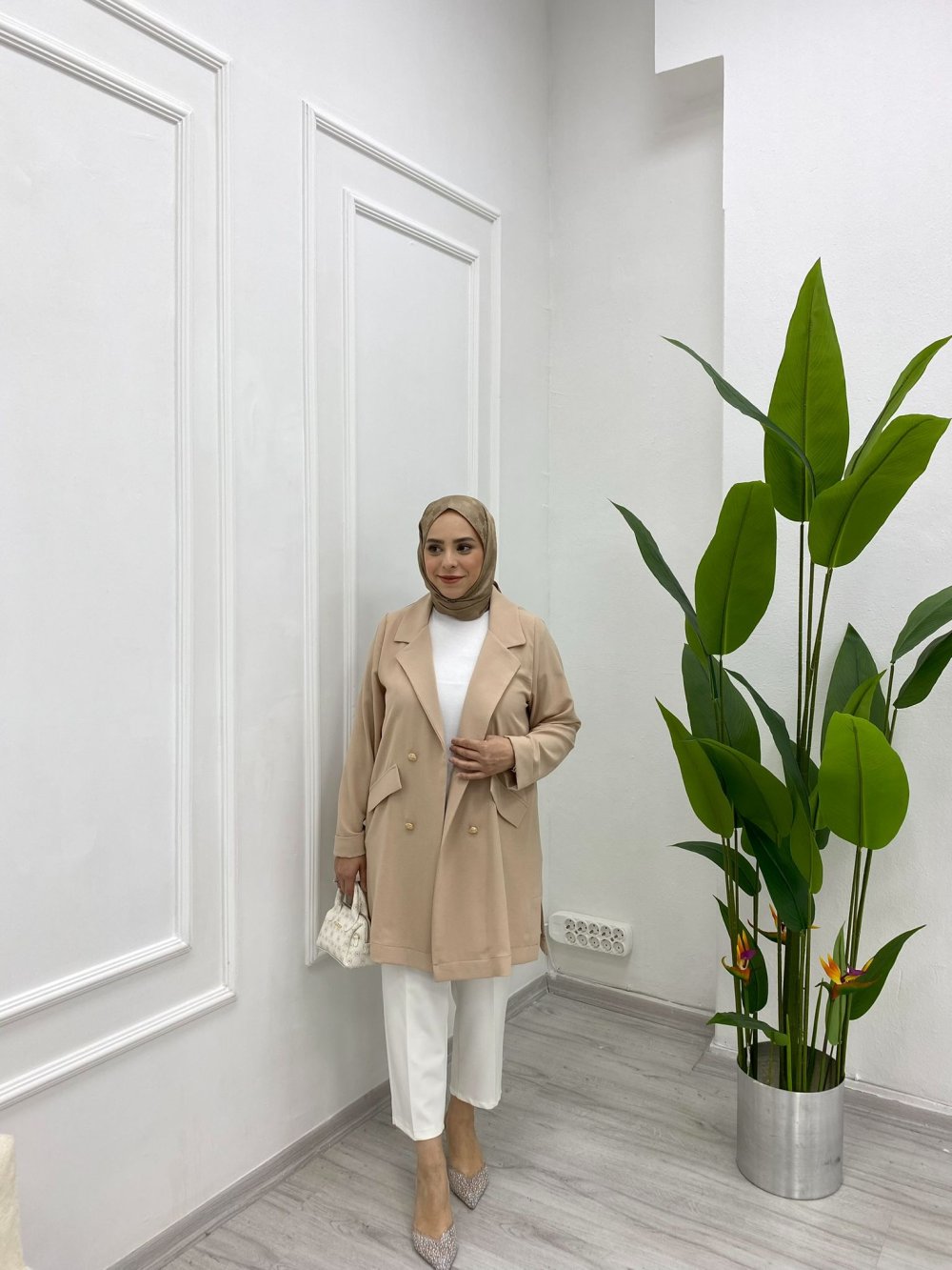 1-2-3-4 beden aralığıyla 38’den 48 bedene kadar uyum sağlar. 85 cm boy uzunluğu zarif bir duruş sunarken; öndeki süs cepleri ve düğme detayları modern ve şık bir görünüm kazandırır.