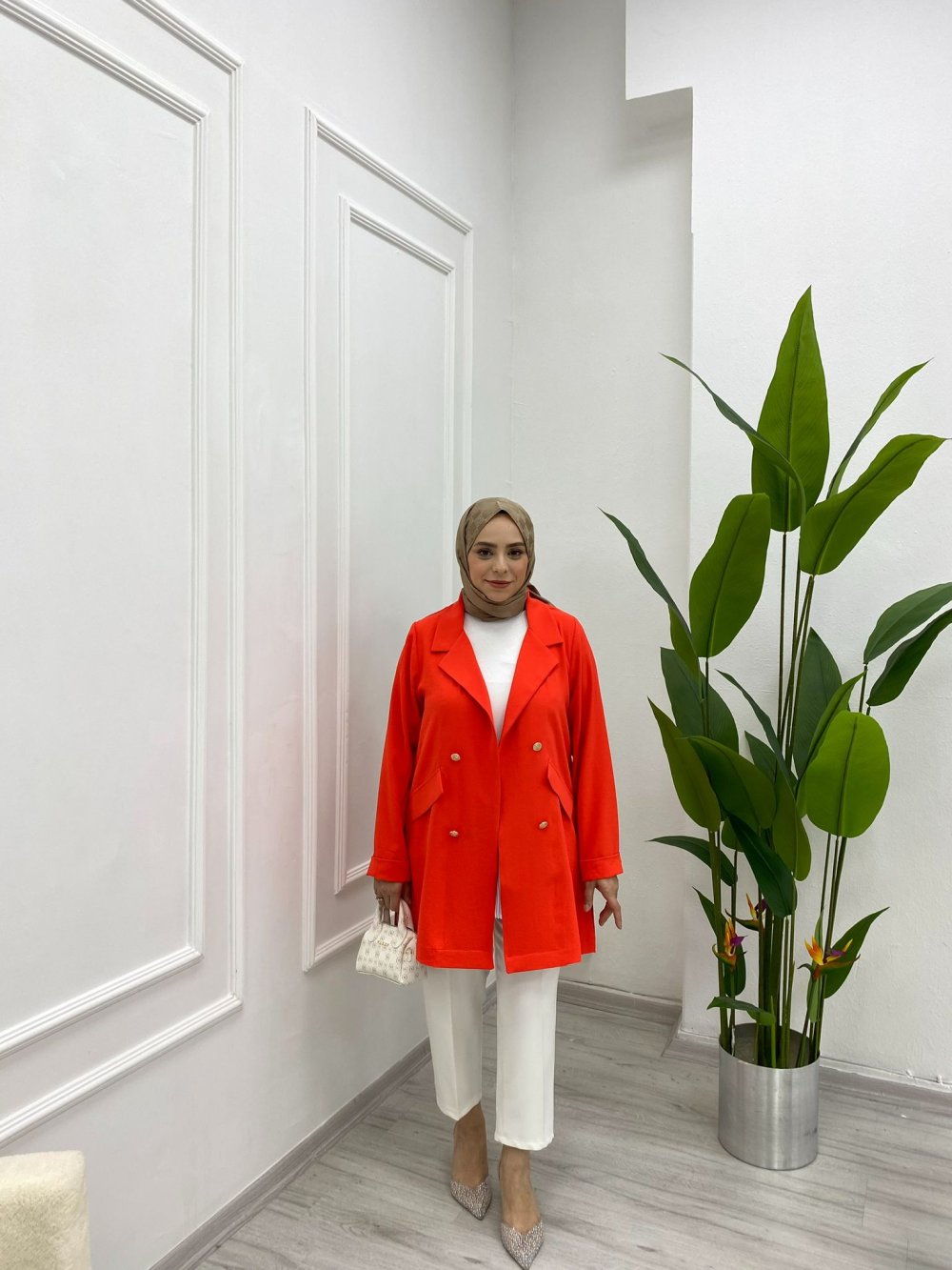 1-2-3-4 beden aralığıyla 38’den 48 bedene kadar uyum sağlar. 85 cm boy uzunluğu zarif bir duruş sunarken; öndeki süs cepleri ve düğme detayları modern ve şık bir görünüm kazandırır.